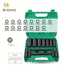 • Conjunto Completo: 15 soquetes profundos de 8 a 32 mm (8, 10, 12, 13, 14, 15, 16, 17, 19, 21, 22, 24, 27, 30 e 32 mm).