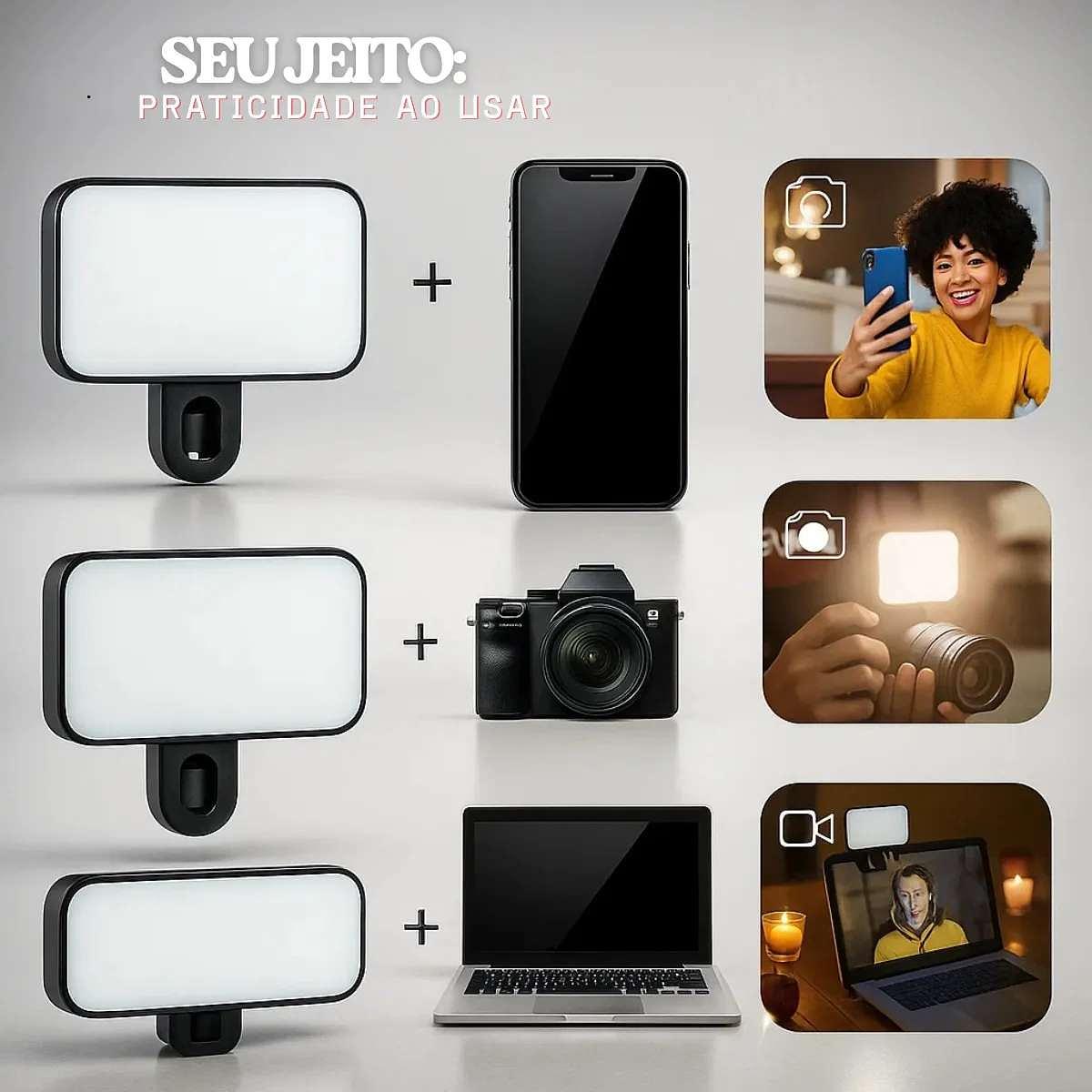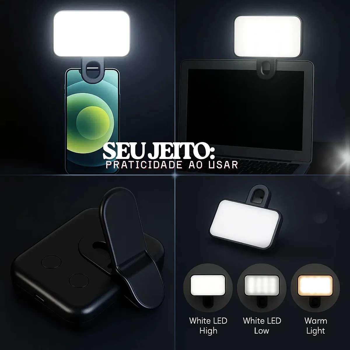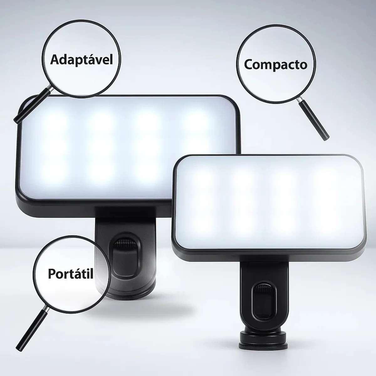 A Luz de Preenchimento LED com Clip é compacta, portátil e extremamente prática. Ela se prende com segurança em celulares, notebooks, tablets e câmeras, garantindo iluminação perfeita em qualquer lugar.