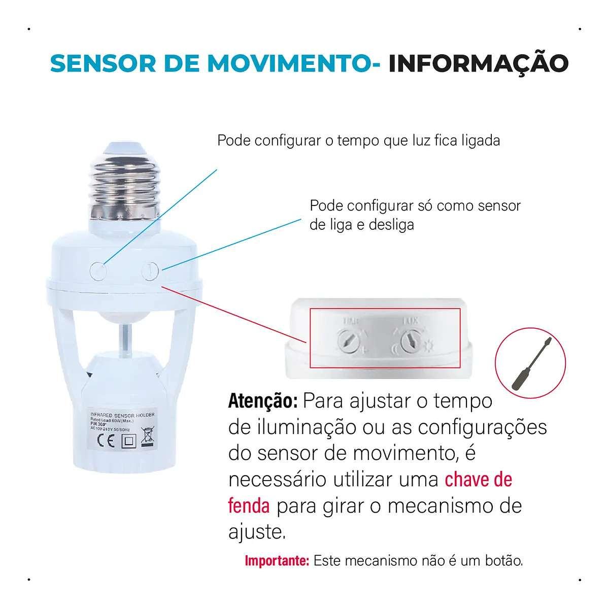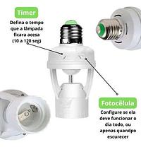 O acionamento é automático ao detectar movimento e o desligamento ocorre após o tempo programado, evitando desperdícios e garantindo mais economia na sua conta de luz. Fácil de instalar, basta rosquear no soquete E27 e utilizar normalmente com a lâmpada compatível.