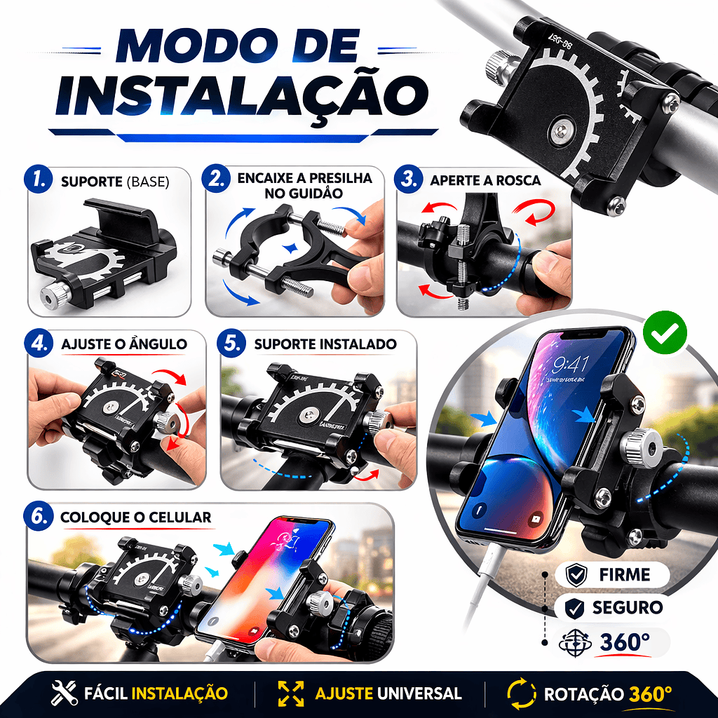 A instalação é simples e rápida: em até 3 segundos o celular já está preso ao suporte, bastando ajustar a rosca localizada na parte traseira.